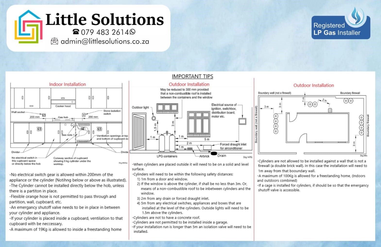 - Indoor Installation from R1995 - includes maximum of 5m approved tubing, fittings, regulator, shutoff valve, labour & COC